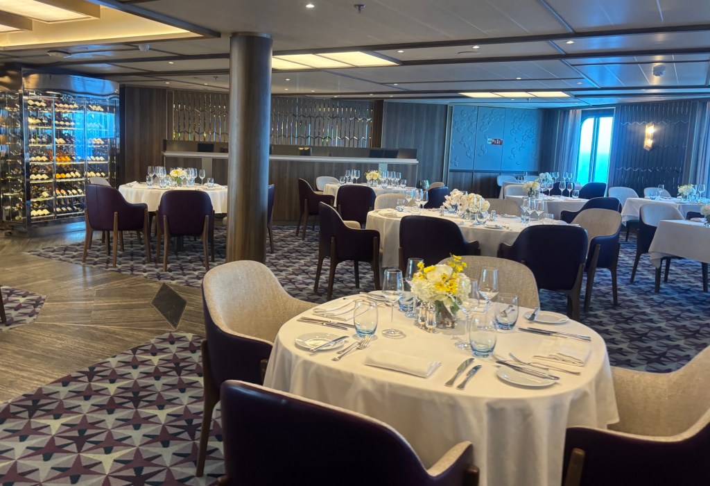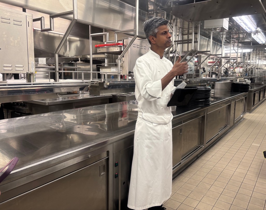 Meals are plated by one chef, typically the one cooking the protein. That is done on all Seabourn ships because each have fewer than 600 passengers. He said that across all restaurant systems, if there are more than 600, plating is done by conveyor with each chef or assistant adding specific items to the plate.