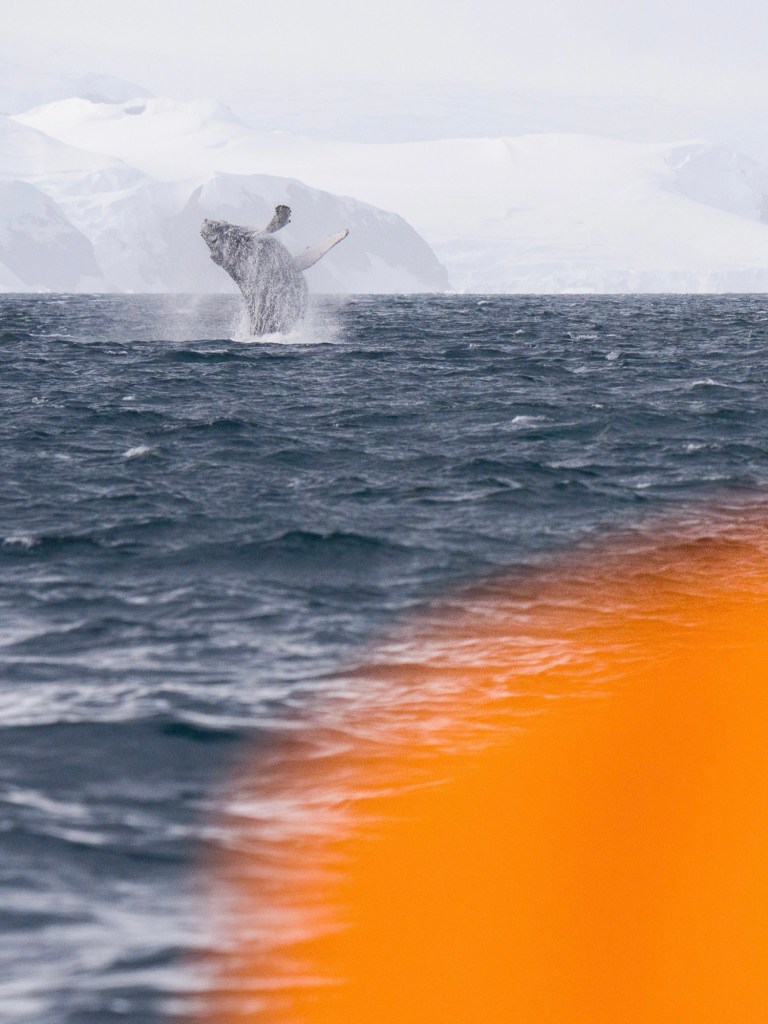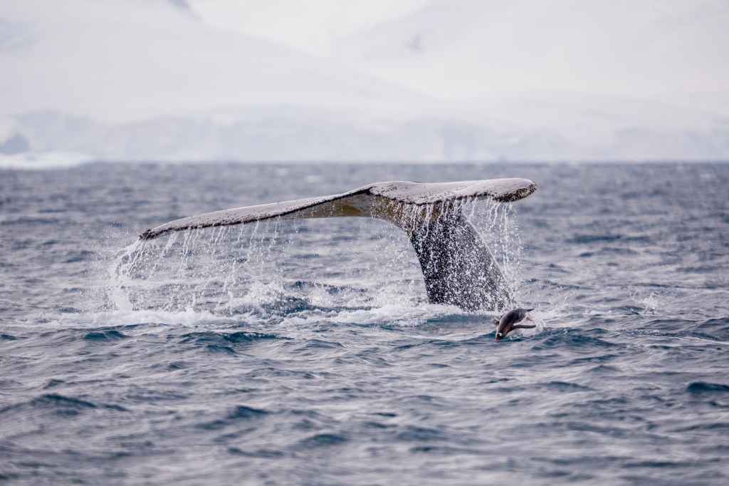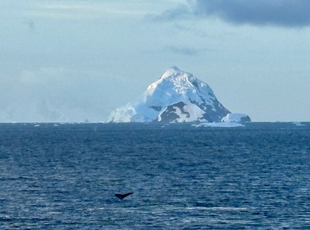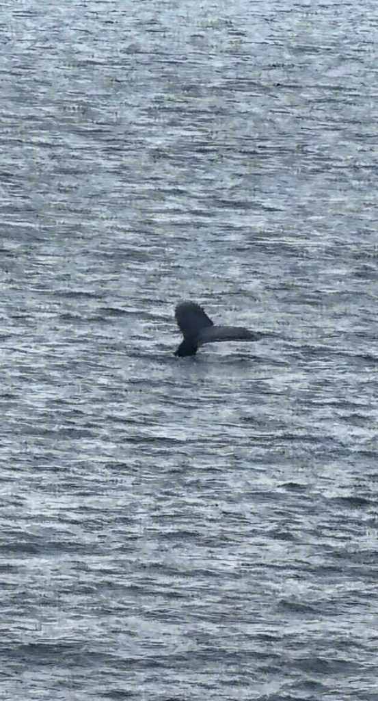 We went to dinner, and noticed whales out the dining room windows. This is one of photographer Harry’s pictures and is so special because it also has a penguin! (The pictures at the end of this post are also his.)