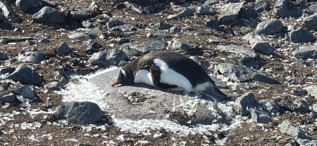 We saw this smart penguin laying on a flat rock catching the morning rays.